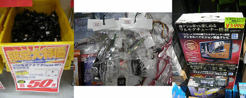 秋葉原他での巡回151003買い物中に気になったものです・・1.海外コンセントコネクターのUSB電源アダプター・・税込み50円。コンセントコネクター形状は2種類・・海外では良く見るタイプ・・日本で使用するにはアダプターが必要ですが・・安いですねぇ・・(マーシャルリアル店)2.USB3.0接続のSATAコネクター・・基盤むき出しですが・・300円とお安い・・チェック用には便利・・1子ゲット(マーシャルリアル店)3.AXIZ?のフルセグチューナー搭載13.3インチDVD内臓液晶TV・・動けば3990円はお安いですが・・B-CASは付いている・・?(森のジャンクショップ)1.USB3.0のA-MicroBケーブルが490円・・こちらにはSATA基盤は付いていないけどお高い・・(PC-NETジャンク通り店)2.SONYのブルーレイレコーダー、BDZ-RX55・・500GBHDD/ダブルチューナー・・税込み18300円・・前からあって売れていないようです・・(じゃんぱら5号店)3.各種メーカーのSATA2.5インチ250GBHDD・・一人2個まで限定・・税込み1799円・・残っていましたが・・そんなに安く無い・・?(PC-NET)1.ジャンクコンテナにBD-Rが一杯・・50枚スピンドルが300円、100枚スピンドルが600円・・ともに枚数が入っているかどうかも保障外・・。表示が無いので・・一切不明・・レーベル面は白っぽいのと黄色っぽいのがありましたが・・。50枚スピンドルをゲット・・とりあえず今のところ使えています・・(磁気研)2.こちらにもSONYのブルーレイレコーダー、BDZ-RX55がありました・・キズが多いみたいですが付属品は必要なものは揃っているようです(B-CASDはなし)・・税込み15800円とお安い・・(じゃんぱらDスタイル)3.Nikon純正の18-300mmズームレンズ、AF-S DX NIKKOR 18-300mm F3.5-5.6G ED VR・・憧れですが・・税別66800円の10%引きとお高くて手が出ません・・(ソフ駅前店)