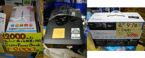 ※本日職場の旅行会のため、出動は明日に延期します・・ 秋葉原他での巡回151003(0927)買い物中に気になったものです・・1.SuperPowerBank・・12000mAh・・2.1AコネクターもありタブレットもOKとのことですが・・税別2000円・・ちょっとお高い・・(150927:あきばお~八号店)2.IO-DATAのUSB接続HDD、RHD-UXシリーズ・・250GBHDD内臓・・税込み4980円・・(PC-NETジャンク通り店)3.AIVN?のツインモニター7インチフルセグ搭載ポータブルDVDプレーヤー、RV-704WPDVD・・本体のみ未ちぇっく?のジャンク・・どうですかねぇ・・(GFセカンド)1.ヒーティングガン・・1000~1800W・・強力ですねぇ・・バカな疑問ですが・・ドライヤーにもなるだろうか・・?税込み1980円・・(セルスターR)2.スマホスタンド・・ちょっと古いモデルだそうで、大処分特価で税別185円・・安くて良さそうですが・・(150927:ドスパラパーツ館3F上海問屋)3.Auのモバイルルーター・・のBTですが・・これはGP02のとうり二つ・・税込み200円・・よいかも・・(アールモバイル)1.トヨタ2000GT・・懐かしいというか憧れの名車でした・・すごいですねぇ・・(150927:まんだらけ)2.Canonのモバイルプリンター、PIXSUS IP100・・ACアダプター付き・・ジャンク保証なしで3980円・・(150927:イオシス路地裏店)3.充電式3WLEDライト・・ちょっと変わった形で目を引きました・・1500円・・ちょとお高い・・(150927:IKESHOP)