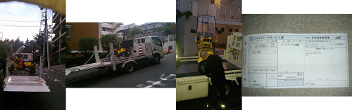 ※すいません・・アップ予定変更です。秋葉原他でのお買い物151011…は明日以降にアップします。 秋葉原からの帰りでした…。いつものように秋葉原を15:08出発。246を順調に走り、東京から川崎に入り・・梶ヶ谷の交差点を通り過ぎた先で・・突然車体の下でバン!と何かがはじけるような引っかかったような音がして、「こりゃ何か引っ掛けたかなぁ・・?」と思い、ガードレールの切れ目から歩道に乗せて停車。ここは246の2車線で交通量が多いため路肩では危ないので。エンジンはかかったまま。車体の下を覗いてみてもひっかかった感じの物はありません。それなら大丈夫かぁ・・ということで道路にひっぱり出し、またがってスタート・・と思ったらアクセルを開いてもエンジン唸れどまったく動きません・・。駆動が後輪に伝わっていないようです・・やっぱりベルト切れ・・? しょうがないので、いつものようにJAFに電話、電話終了時点で、16:26.35分ほど待つということなので荷物の整理などをして準備。16:46そこそこの大きさのトラックで登場・・状態を説明すると・・やはりベルトかなぁ・・とのこと。見てもらって、やはりベルト切れが一番可能性が高いとのこと。簡単修理ではムリなので、諦めトラックに積み込み。始めは自宅近くのナップスに運んでもらうつもりだったのですが・・やっぱり久しぶりいじってみたくなったので自宅に運んでもらうことにしました。17:30自宅着、約7.5kmのけん引距離でした。2010.12.04のジャイロXのときは赤坂だったので、15kmの無料範囲に入らなかったのですが、こんかいは無料でした。お蔭様で、ありがとうございました。さて整備マニュアルを引っ張り出して、ベルトを注文して・・さて修理は何時になるのでしょう・・?1.屋根付きにしているので背が高い・・しかし横向きに積むんですねぇ2.横から・・リフトが良い感じ・・3.自宅に着いて・・厳重な押さえベルトを外しています・・17:30頃はもう日が短く薄暗い・・4.JAFロードサービス書・・毎度お世話になりました・・