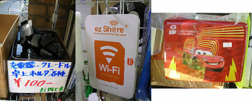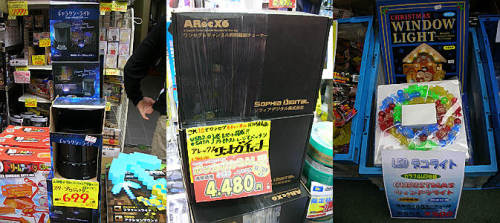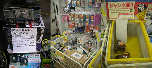 相変わらず森のジャンクショップは準備中のため、PC-NETジャンク通り店へ・・。店頭で20Lのポータブル保冷温器を売っています・・動作未確認のジャンク扱いで税込み2980円・・さてどうでしょう・・?docomoのポケットチャージャー5000mAhが税込み1200円。例のブラックベリーの純正?ケースが案の定税込み250円に値下げ。SONYのリモコンマイク付きのイヤホンが税込み500円。前回の3Dマウスは売り切れたようです・・面白そうだったので1個買っておけば良かった・・残念。ダミーカメラが4種類ほど一杯並んでいます・・税込み980円とは高いなぁ・・と思ってよく見ると・・どうやら本物のようで、未チェックジャンク扱いなので・・ダミーカメラということで動かなくても知りませんよ・・ということらしい・・良さそうな感じですが・・。 通り過ぎた森のジャンクショップ・・ようやく開いていました。相変わらず4GBMicroSDHCカード、税込み199円で売っています。例のカーズのポータブルDVDプレーヤーはなくなったような・・。Trywinの外部GPSアンテナが税込み499円・・。ジャンク道を南下して途中曲がって・・杉元ガレージへ・・だいぶ準備は進んだようです。電飾のペガサス?が5000円。小さなトナカイセットが1500円・・人目をひきます・・何セットかあるようです・・。手すり用のごっついアンテナ台が1000円。なにやら工具が一杯出ていて、いつもの電動ドリルなんかに混じって、エアー式のサンダーが1500円。手持ち式の電動丸鋸?が5000円などいろいろ。そういえば・・ということでU-SHOP2の前に行ってみてやっと確認できました・・元液晶ばんばん?だったところが、「東京らーめんタワー」というラーメン屋さんになっていて行列ができています。三月ウサギ新店と呼んでいたところがドスパラのゲーム館になっていました・・これですっきりしました。 少し戻ってicon・U&J周辺・・無し・・。あきばお~八号店・・例の各個スイッチ付きのテーブルタップ・・4個口や6個口で年末特価とやらで、税抜き599円、699円、799円といろいろ。今話題のネジザウルスが売っているではないですか!この間TVでみたばかり・・税抜き1699円・・実際幾らくらいで売られているものなのでしょう・・?欲しいですがひとまず保留。再度ジャンク道を南下・・インバース・・小物も特にありません。ノートとデスクトップは見ないことに・・。XDカードまだありますが・・やはりスルー。他は特に無し。tokkaバザール2号店・・お店の奥の方に電動パワーカッター・・まだあります。そういえばカミさんが軽いキャリングカートが欲しいと言っていたのを思い出し・・見ると税込み950円で売ってます・・ちょっとちゃっちい感じですが・・軽そうです・・。九十九アウトレット・インバース2・・無し。さらにジャンク道を南下、オレンジ前露店・・う~んあんまり変わりません・・残念。