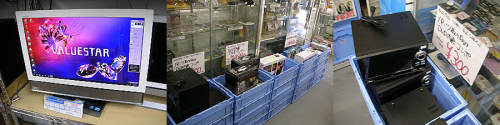 また戻ってtokkaバザール・・特になし。ジャンク道をに入り、まずはセルスターR・・ポータブルDVD等のジャンクが一杯・・ただし前回のように本当のジャンク100~300円が・・ありません。・・と思ったらDVD内臓コンポが、パーツ取り向け・・という恐ろしいジャンク300円・・。ただとにかくデカイ・・これは持って帰れないということで・・スルー・・。このコンポの正常品が税抜き3980円で入り口近くにあります。例のツインモニターのDVDプレーヤーが面白そうですが税抜き7980円・・お高い・・。他のフルセグ付きやワンセグ付きも5000円近くでお高い・・残念。そのほか店内にはモリタの消火器が10本箱入りでデ~ンと置かれています。値札はまだ無いですが、「モリタはその業界では大手ですよね・フルセグTV付きコンポの正常品が税抜き6980円。これもまだ値札が付いていませんが不具合品が店の奥に山積み・・来週あたり出てくるのでしょうか・・?昔のSANYOのXactiのように仕入れがユニーク。 MOQMOQ・・何だかえらく整理されて見違えるようです・・バッファローのHDMI切り替え器が990円。旧QC-PASS・・跡地には予告どおりピロピロ麺屋というちょっとふざけた名前のラーメン屋さんがオープンしています。あっち系かと思いきやちゃんとしたラーメン屋さんでした・・ここらはラーメン屋が周囲に多いので結構きびしい感じ・・あの旧QC-PASSの広いお店にあまりお客さんがいるようには思えませんでした。U&Jmac・・フルセグつきのポータブルDVDプレーヤーがジャンクで700円・・もちろん本体のみでミニB-CASはありません。中ブタ不良と書かれているので、前回のように読み込みにいけないのだったら・・何かつめれば・・。アールガーデン・・監視カメラセットが税込み980円・・前はもっと高かった気が・・。例の2.5-インチSATAHDDが2個入るコネクターが一杯あるケース・・1980円が500円に値下げ・・迷いましたが・・すぐ使うとは思えないのでスルー・・。 再度ジャンク道を南下・・パレットタウン・・さすがに例のAuモバイルルーター、100円はなくなっていました。他も特に無し。マーシャルリアル1号店・・ジャンクのPCやタブレットが出ているということですが姿も形もありません。ジャンク棚も特にありません。森のジャンクショップ・・はまだ開いていません・・他のお客さんが遅いと抗議していました・・。先にPC-NETジャンク通り店・・2.5インチ160GBHDDが税込み1000円。3.5-インチ1TBHDDが税込み2980円・・お安くなりました・・。hpのシンクライアント具付き・OS付きが税込み19999円。前回のバラックベリーのケースは予想に反して税込み300円・・これはお高い・・マニアの人には欲しいアイテムなのでしょうが・・。それとインバースのように通電確認コーナーができていました・・最近は親切なお店が多いですねぇ・・。HPのCore2液晶一体型PC・・具付きOSなし・・が特価品で税込み5999円。3Dマウスが展示されて操作できるようになっていたので、やってみましたが・・グーグルアースで酔ってしまいました・・しかし税込み500円なので面白いかも・・。もう一度森のジャンクショップに行きますが・・まだ開いていません・・まったく・・。