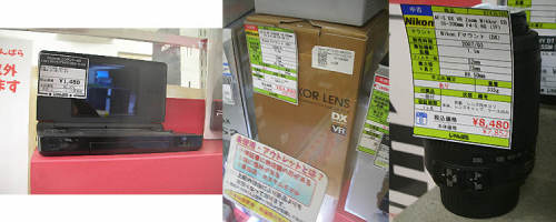 ※耐震・リホーム/引越し準備が忙しくなってきましたので、残念ながら当面隔週くらいのペースで出動としました・・ 秋葉原他での巡回151219買い物中に気になったものです・・1.NintendoのDSLite・・付属品全揃いですが、キズ多数。割れあり・・で税込み1480円・・大体セットものではこの辺が標準でしょうか・・?(じゃんぱら1F)2.Nikonの18-200mmズームレンズ・・未使用・アウトレットの純正品のせいか税込み64800円とお高い・・とても手が出ません・・(じゃんぱら1F)3.こちらはNikonの55-200mmズームレンズ・・レンズ内ホコリ有り・・で税込み8480円・・ダブルレンズキットの片われでしょうか・・?(じゃんぱら1F)1.Micron/SliconPowerの200PIN 1GB PC2700 SODIMMDDR・・税込み980円・・安くなってしまいました・・何世代前でしょう・・?めまぐるしく世代交代して今はどうなっているのでしょう・・?(じゃんぱらBF)2.Auの共通ACアダプター04・・MicroUSB、HS-SJA・・使用感ありますが・・税込み480円・・(じゃんぱら本店)3.SONYのラジオカセットレコーダーWALKMAN、GX410・・おぉ・・動作確認済みですが無保証なのに・・税抜き7000円もします・・(U-SHOP1F)1.ドライブレコーダー、HD DVR・・未使用の中古品ですが・・未チェックの無保証品・・税抜き1980円・・保証無しではちょっとお高いかも・・(U-SHOP1F)2.倒れないマグカップ/マイボトル・・倒れないなんて面白そうですねぇ・・税抜き1280円・・肝心のマホービン機能はどうなんでしょう・・?(U-SHOP1F)3.大人の科学・・付録は円筒レコード式エンジン蓄音機・・上に組み立てられた見本がありますが、これまた面白そうです・・税抜き1500円・・(U-SHOP1F)