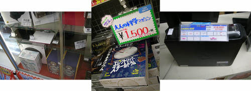秋葉原他での巡回151122買い物中に気になったものです・・1.Sharpのブルーレイレコーダー、BD-HDS43・・320GBHDD、リモコン付き・・で11800円・・揃ってこのお値段ならまぁまぁでは・・?(ジャングル本店)2.ジャンクカーナビ、ベルリスのVS-ST300A・・・・ワンセグ機能付き、地図データは2011年、本体のみ?(台座とか無いそうです・・)・・通電確認のみで保証無し・・3980円・・(イオシス路地裏店)3.どでかい「いろえんぴつ」・・どうやらケースのようで中に色鉛筆が24色入っているらしい・・500円・・(千石電商)1.スタースノーグラバー・・靴の滑り止め・・「-40℃」と書かれているので、この温度でも硬くならないということ・・?しっかりして良さそうですが・・お値段1000円とちょっとお高い・・?(千石電商)2.SONYのフルHD対応ビデオカメラ、HDR-SR1・・30GBHDD・・通常価格税抜き13000円がゼールで税込み8000円・・ずいぶん下げましたねぇ・・(ジャングル三号)3.アップルのipodnano?・・税抜き300円のが一杯・・袋入りの綺麗なのが税込み500円・・(ジャングル三号店)1.例のFUJITSUのスリムPCのベアボーンPC、D581・・Sandy-Bridge LGA1155ソケットでI7も載るようですが・・売れないのか・・いつの間にやら値下げ・・DVDマルチ付が3500円、ODDなしが2980円・・(万世商会)2.CANTABILEのPSVITA2000用AC充電器・・コネクターがMicroUSBなので汎用性あり・・確か5V/1Aだったかと・・ケーブル長1.5m・・税込み200円・・お一人様2個まで・・ということでしたが・・一杯ありました・・(IKESHOP)3.各メーカー3.5インチSATA250GBHDD・・税込み880円・・お一人様4個まで・・こちらも一杯ありました・・無保証・・(PC-NET)