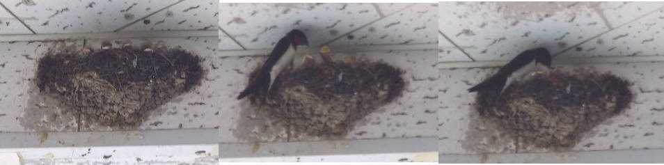 その後なかなか雨等があって(雨の日はバスに乗ってしまうので)見られなかったのですが・・7/8朝見てみたら、例のシャッター近くの巣から4~5羽の雛が顔を出していました。すでにもう結構大きくなっています。写真を撮っていたら親が餌を持ってきて与えていて感激!続いて7/10、同じように雛がいる巣を撮っていると、やっぱり親が飛んできて餌を与えだしました・・育雛は忙しい忙しい・・。1.7/8雛が5羽ほど顔を出しています2.親が飛んできて、雛が一斉に反応3.餌を口移しであげています1.7/10雛が1羽少ない?2.親が来ましたが餌やりは撮れませんでした3.餌やり後、周囲を警戒しているようです「画像倉庫が一杯になったので、続きはこちらで」と書かれたブログは、ヤフーブログが廃止されたため読めません。下記のアベマブログに引き継がれていますhttps://ameblo.jp/delivery0410195