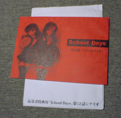 アニメ版School DaysのDVD3,4,5,6巻とマジカルハートこころちゃんのそれぞれ初回版に付いている応募券を送ると貰える特典。 締め切りは4月待つだったか。あのシーンのト書きは塗りつぶされている。役所に文書の開示請求したんじゃねーんだから。