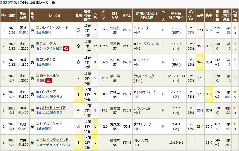9月は8頭で8走でした。これは今年の月別で2月の6走に次いで少ない出走数です。最終週は出走馬もなく、連続出走も続かないと言うなかなか寂しい月になりました。内容としては地方交流戦を含むとは言え2勝を挙げ、結果は伴わなかったですが3歳戦のトライアルに2頭が出走とそれなりに楽しませてくれました。8月の成績です。10月はちょこちょこと出走予定はありますが、3歳未勝利馬がごっそり引退し、2歳馬が全然出てこない状況で更に4歳馬が全馬脚部不安でまともに走れないと言う状況なので9月と同等かそれ以下の出走数になる可能性もありそうです。ランキング参加中!クリックお願い致しますm(_ _)m一口馬主ランキング