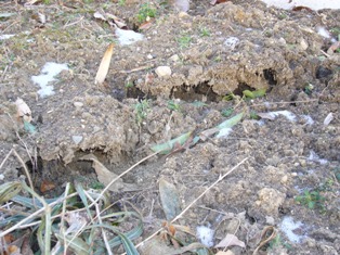 こんにちは、サウルスくんですぅ朝、散歩してたら、何やら怪しい空洞を発見したですぅん~、動物の巣ですかねぇ博士「サウルスくんや、何をしているのかな」あっ、博士変な穴があるですぅ誰が住んでるですかぁ博士「ははは、これは巣じゃないよ」え~っ、じゃあ、何ですかぁ博士「実は霜柱の痕なんじゃ」霜柱なんてないですよぉ博士「この神流町は昨日からとても暖かくて、昨日なんて10℃を超えてしまい、霜柱が溶けてしまったんだね朝晩も冷え込みも緩かったんで、霜柱が成長しなかったんじゃろ」へぇ、そうなんですかぁ博士「あっ、サウルスくん良く見てみると、霜柱が残っているところもあるぞ」ホントですぅ