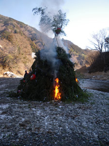 こんにちは、サウルスくんですぅ毎日寒い日が続いているですぅ今日は、神流町のどんどん焼きを紹介するですぅ以前は1月15日(成人の日)だったのですが、最近はその前後の日曜日で、今年は17日に神ヶ原の川原で行なわれたですぅ昔は子供会が主体で行なったのですが、今は子供が少ないので、地元の消防団が主体となって、木の枝や竹などでやぐらを作るですぅ近所のお父さんお母さんや、子供たちが、お札やだるま、正月飾りなどを持ち寄り、やぐらに入れて焚き上げ、無病息災をお祈りするですぅ家に飾っていた繭玉も、残り火で焼いてたべるですぅ当日は、地元で捕れた鹿の焼肉もあったですぅ皆様もこの一年健康でありますようにですぅ