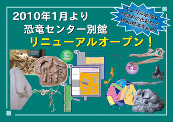 こんにちは、サウルスくんですぅしばらくお休みしてたリニューアル情報ですけど、久しぶりに再会しますですぅ1月4日から恐竜センター別館はリニューアルオープンしたですぅその内容とは...1.別館1階は多目的ホールという集会場のみだったんですけど、その3分の1を使い、展示場にしたですぅそして、そこには神流町産化石関連の標本を約60点(そのうちの約40点は新標本)展示してあるですぅ2.別館2階のモンゴル恐竜の展示場に、タルボサウルス完全化計画の他に、大小20点を超えるモンゴル恐竜ほかの展示を追加したですぅさらに、お子様向けに興味深いトピックを、絵を中心としたパネルで表現したですぅ3.別館3階には中国産の羽毛恐竜や始祖鳥など8点を追加謎の「大人の恐竜学」というコーナーも設置したですぅこのような改装をすることで、1階では最新の神流町産化石の研究成果を披露し、2・3階ではモンゴル恐竜の充実と一部の恐竜から鳥類が進化した過程を垣間見ることができる展示へとなったですぅ是非この機会に、新しくなった恐竜センター別館に調査に来てほしいですぅ次回からは追加された標本を探検してくですぅ