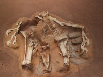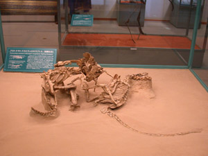 今回は恐竜センターに展示している格闘恐竜(Fighting Dinosaurs)を取り上げます。 恐竜センターがモンゴルから恐竜たちを借りてきたのが今から14年前。その中で特に借りたいと願ったのが、この「格闘恐竜」だったそうです。 格闘恐竜は1971年(昭和46年)に南ゴビのツグリキン・シレでモンゴルとポーランドの共同調査により発見されました。世界でも大変珍しい闘ったままの化石であることから、この格闘恐竜はモンゴルの国宝であるとか。ちなみに、写真左は植物食恐竜のプロトケラトプスで、右の寝ている方は肉食恐竜のヴェロキラプトルで、かぎ爪がプロトケラトプスの首の周辺に刺さっているのが見えますか?これによって、右のヴェロキラプトルの後脚のかぎ爪の使い方が分かりました。 格闘恐竜はかなりリアルですよね。実はこの状態にするのに、10年以上かけてクリーニング作業したそうです。 すばらしいものを作るにはやはりじっくり時間をかけないとだめですよね。By 恐竜センター(佐藤)