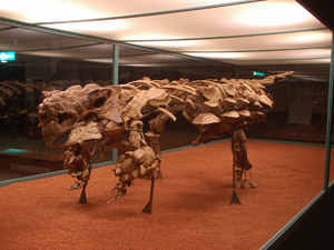 今月はサイカニア クルサネンシス(Saichania chulsanensis)を取り上げます。 サイカニアは白亜紀後期のモンゴル国南部から産出し、体長4mあります。サイカニアは鎧竜(よろいりゅう)と呼ばれるアンキロサウルスの仲間です。鎧竜は背中や尾にかけて骨質()のスパイク状のとげが鎧のように覆()っているのが特徴()です。 いかつい印象を受けるサイカニアですが、骨の中はすかすかのスポンジ状になっていて、体を軽くする工夫が見えます。 また、鼻の穴から頭の内部にかけて、複雑な形をしています。サイカニアは砂漠地帯にすんでいましたので、暑く乾いた空気を吸い込んでも冷やして湿()らせるようにしていたようです。 恐竜も環境などに合わせて体の内部を進化させていたことが、これらからうかが()えます。 とはいえ、ライブシアター上映中にサイカニアが登場したとき、「あっ、ブタさんだ」といった女の子の声が私の耳に残っています・・・By 恐竜センター(佐藤)