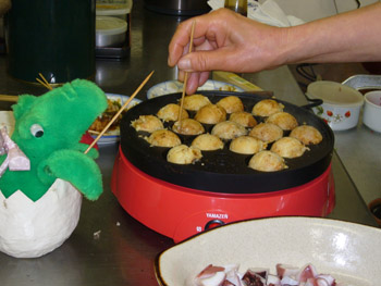 こんにちは、サウルスくんですぅ厨房の人たちが集まって、何かしてるですぅ何してるですかぁ厨房「今日はね、たこ焼きを作っているんだよ」そうなんですかぁ厨房「これは、ただのたこ焼きじゃなく、ゆずみそ、こんにゃく、キムチとかが入ったスペシャルバージョンなんだよ」わぁ~、食べたいですぅパク、パク・・・ソースがなくても、おいしいですぅ~(ゆずみそ)この食感は・・・Goodですぅ(にんにゃく)辛いですぅ(キムチ)