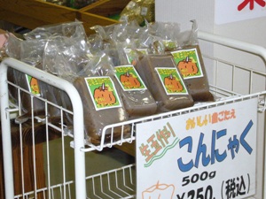 こんにちは、サウルスくんですぅセンターの農産物コーナーの一角にこんにゃくコーナーがあるんですぅセンターの職員さんが手作りしているんですぅこれは生のこんにゃく玉から作ったものですぅ以前、作っている工程をブログで紹介したこともあったですぅこのこんにゃくを食堂で食べることができるですぅそのメニューがこちらこんにゃくおでんですぅ1年中人気のメニューですが、寒い季節に温かいこんにゃくおでんで温まってくださいですぅお土産にもオススメですぅ