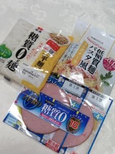 食品表示をジロジロと見ながら一喜一憂するのも楽しみになってきました。ついでに糖質0製品なども検索。パスタの代用品みたいなもの?を探しているとこんにゃく麺みたいなものと乾麺のまずそうでお高い商品を発見。とりあえずスーパーでチェック。昭和 蒟蒻効果とはごろも ポポロスパ CarbOFF (低糖質パスタ)を試したかったのですが取り扱いナシ。発見できたまるふくの低糖質麺カルボナーラと紀文の糖質0麺、日本ハムの糖質0のハムをゲット。見た目に若干の不安を覚えつつ購入。低糖質麺パスタ、レビューも賛否両論ではあったのですが糖質0にしては美味しい的な雰囲気だったのであまり期待はしませんでした。とりあえずお試しで購入です。調理は水洗いしてオリーブオイルで炒めて粉末ソースであえるだけ。このパスタはパスタの代わりと言われるとちょっと厳しい、、、最初からこんにゃくパスタとかで売ってくれたほうがいいかな。パスタらしいもちもち感はなく、若干のボソボソ感がありパスタというにはちょっと辛い。味はかなり濃いので野菜でかさましすればヘルシーに沢山いただけるかもですね。値段をお味を考慮してリピはナシ。これを食べるのであれば私はパスタの量を減らして食べたほうがいいと思います。