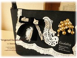 黒です* (*´艸`*)*今回は大人チックにかっこよく♪(←勝手な思い込みです*汗*)お気に入りのあの*rose*レース、先日レース屋さんに行ったらまた再入荷されていて即買い♪♪早速飾っております***どうしても、黒のベルベットおリボンを飾りたく・・・・・でも~ベースが黒だから目立たなくなっちゃうんです^^;そこで♪今回はお気に入りの、ヴィンテージレースも一緒に添えて、ちょっぴり存在感のあるシルエットにしてみましたこれならおリボンの存在に気づいてくれるかなぁぁぁ*^m^*その下にはデザインがとっても素敵なスイスのイニシャルモチーフをこのモチーフがまた、大人チックな雰囲気の大事な役割なんです*^^*bイニシャルモチーフでもいろんな形があるのですが、この形が相性ピッタリ♪♪さらに、ヴィンテージ*パールタッセルでジャラジャラとシャンデリア風に動きのあるシルエットに***そして黒タグでキリッと♪♪ (*´艸`*)何を作っているかわかっちゃっうよね***ちょこちょこ登場する着せ替えbagです*^ー^*ノ(の予定・・・・・)まだ未完成だケド・・・・汗このデザインはそろそろこれで最後かなぁぁ^^来年からは、新たな感じでチャレンジしたいなぁぁぁ♪って密かに思ってます*^m^*(多分・・・)さてと。今日は無事に完成できるかな?!ぜひぜひ、ガンバレ~♪ぽちりお願いします*^人^*本日は31位です**遊びにきてくださってありがとうございます*^^*まだまだお勉強不足ですが、足を運んでくださいまして本当にありがとうございます♪ポチッと応援、元気でちゃいます(*´艸`*)××××××××××××××××××××××××× * HP * *blog*ランキング *HP*ランキングこちらの*ランキング*にもポチッとお願いします♪*^ー^*×××××××××××××××××××××××××*handmade Auction***本日最終日です♪***^ー^*ゝお待たせいたしました。本日の癒されたいむの時間です♪あれ?来週って・・・・・クリスマスなんだ~^^;すっかり忘れてたわぁ♪空き瓶に、このラベル貼ったらすっごく素敵なインテリアに飾れちゃいますネ♪♪^人^さっくり着れちゃう感じがいいですね*^ー^*bナチュラルなLinenがとってもキュート♪♪以上。癒されタイムの時間を終了します♪^^