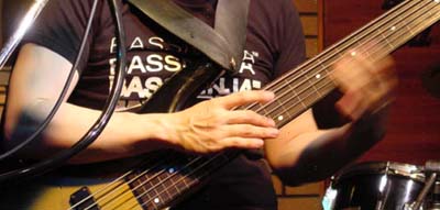 開演時刻の8:00pm---彼は静かに現れた。 フイを突かれた客は拍手をするでもなく彼のセッティングを黙々と見つめていた。 ピーンと張りつめた緊張感。  Moon製の特注6弦ベースを2本のストラップで支え 、“ベースマニア”による“ベースマニア”のための“ベースショー”が幕を開けた。