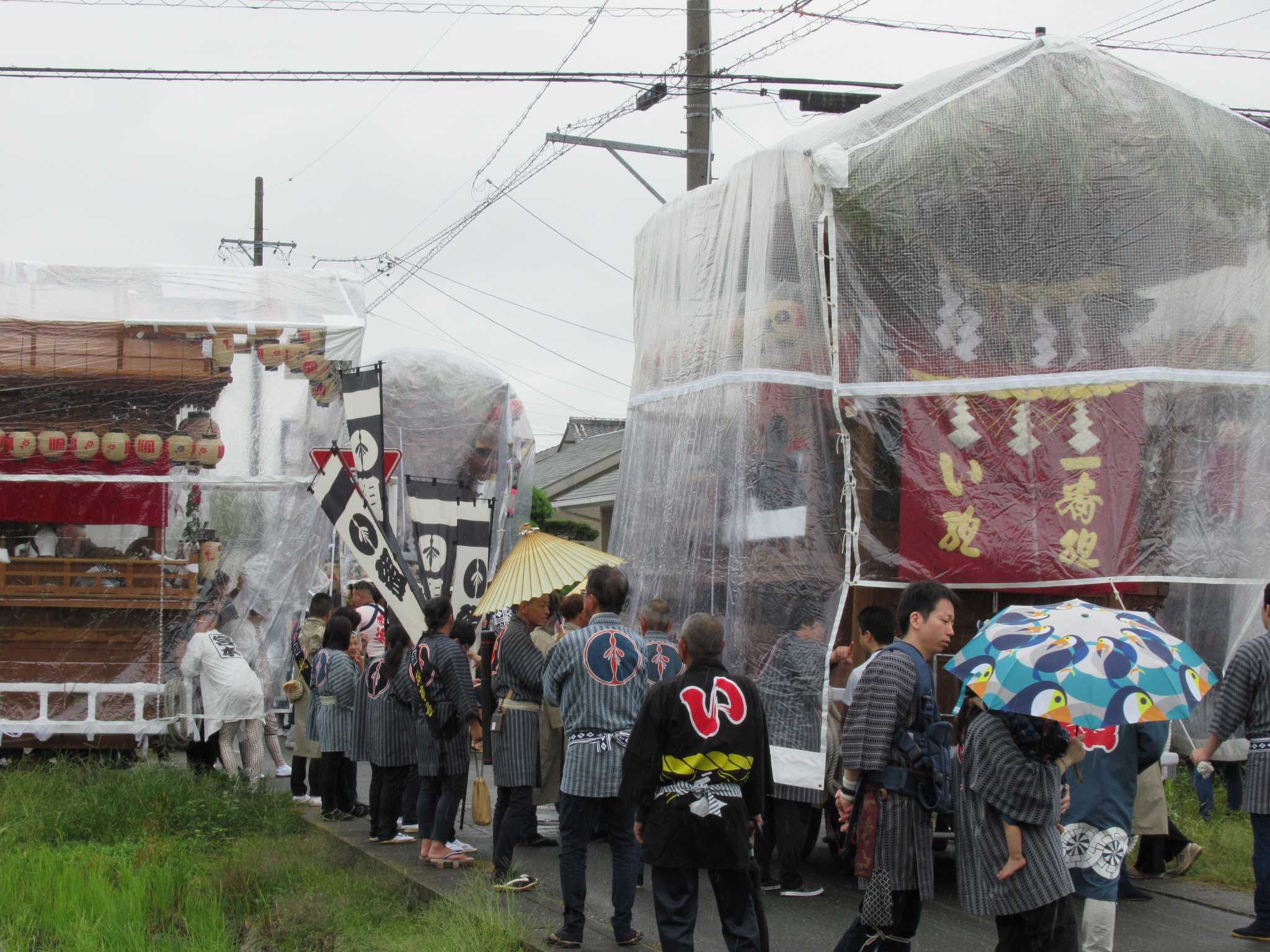 台風23号がやってきているので折角の村祭りが雨です~Aーー;)ここでは山車をぶつけ…