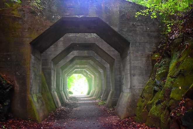 八角トンネル 熊延鉄道遺構 ウキシペディアより。熊延鉄道(ゆうえんてつどう)は、かつて熊本県熊本市の南熊本駅から同県下益城郡砥用町(現・美里町)の砥用駅までを結んでいた鉄道路線およびその運営会社である。1964年(昭和39年)に廃止。 トンネルといっても、山をくり貫いたトンネルではなく、八角形のコンクリートが間隔をおいて、7つ連なってた。 二俣橋。 11月~3月の11時~正午にかけては、太陽の光が橋の下にハートの型を写し出すことが話題になり、「ハートが出来る石橋」で恋人の聖地に登録されました。ってさ。しまった8月の蝉やった。 馬門橋 中央が低く、下反りになっている。両岸絶壁滝がおもろい。 山に入って行く。 日本一。 日本一の階段3333段。 標高は860メートルで 高低差は600メートル。こんぴらさんへはニ度かお参りしたことがあるが、本宮までは785段 。 トイレ押し。 所要時間については 早い人は1時間以内で登れますが 一般の場合は上り2時間 下り1時間 計3時間位を見込んで下さいとのこと~、あかん、そんなぼやぼやしている時間ないのでパスすることにした。 勇気ある撤退、時間内から先に進む。 氷川ダム、ドドーン。 吊り橋。 道細くなり、やまみちに。