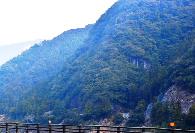 熊野川、和歌山県新宮市側を登る。熊野川を渡り、三重県熊野市に入る。延元文字岩。どれのこと?なんのこと?銅山だったらしいが。隠れ滝。細い道をやって来たが、上り坂になってから、スピード緩めなくてもすれ違うぐらいの道幅になった。まあ、一度も車すれちがわなかったけど。隠れているからか見えない。落差12メートルだそう。車道からやや荒れた遊歩道を3分程歩くと滝下に辿り着く事ができるらしい。松山滝。落差20メートル。荒滝。落差30メートル。楊枝川の支流な。布引の滝到着、おお、なかなか凄い。のぼっても何も見えない。何の施設?熊野一枚岩花崗斑岩の岩盤。滝は四段。一段目は12メートル、二段目は3.5メートル、三段目は7.7メートル、そして四段目は29.1メートルの落差。52メートルか。1段目は見えませんな。布地を垂らしたように音も飛沫もたてずに流れ落ちている。ニューって感じ。こっこから下に降りていく。きらずの森(20ヘクタール)下って、上を見ると、えらく上にガードレールが。滝壺まで降りられるが、滝自体は最下段しか見えなくなる。あらま。四十八ケ山秘所行場の1つとされ、熊野信仰の修行が行われていた場所だったとか。