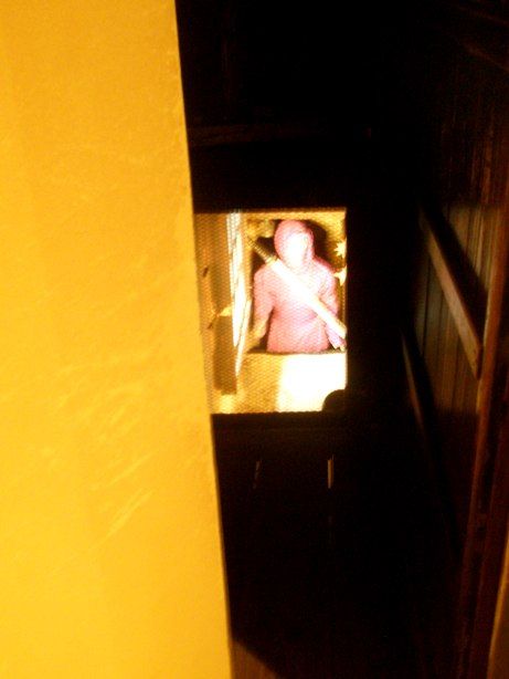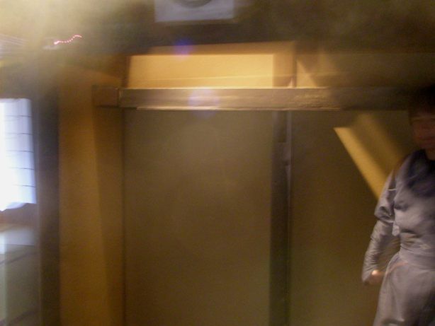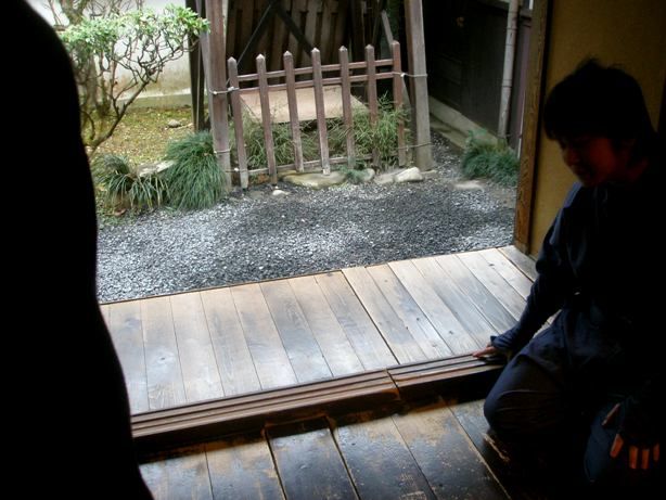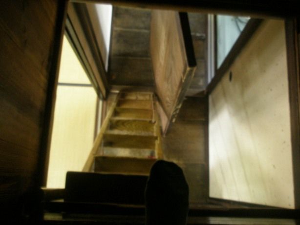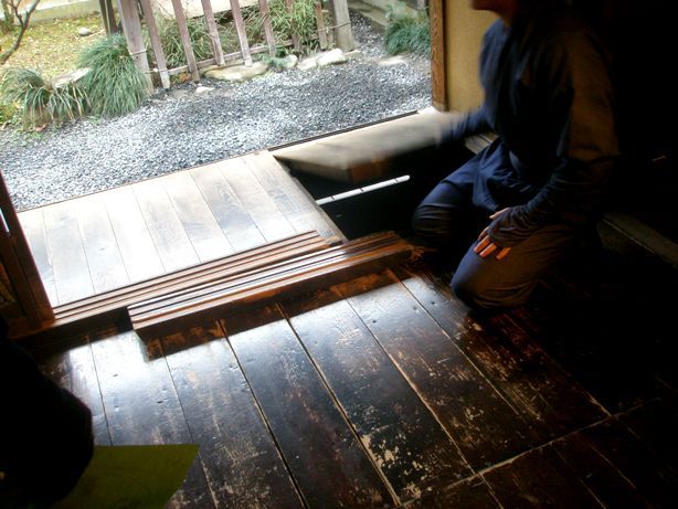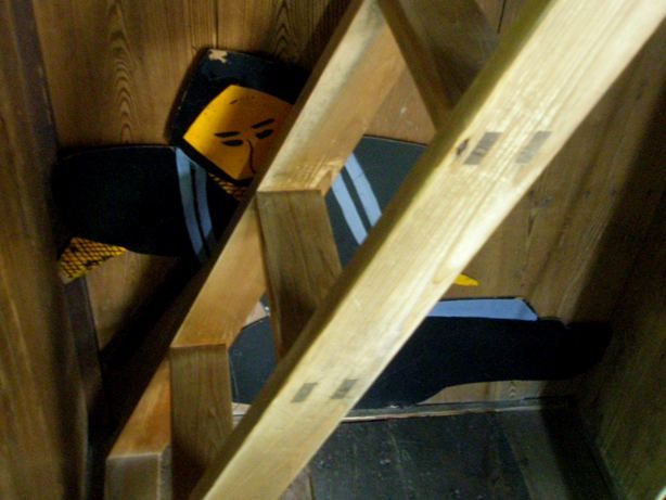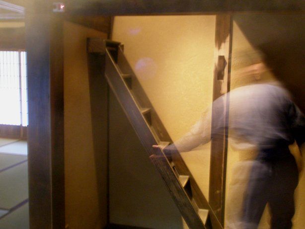 急な階段であるが、のぼり用であっって、忍者は降りるときは、飛ぶのだそうだ。だから、老人になると、忍者はご隠居になるという説明であった。