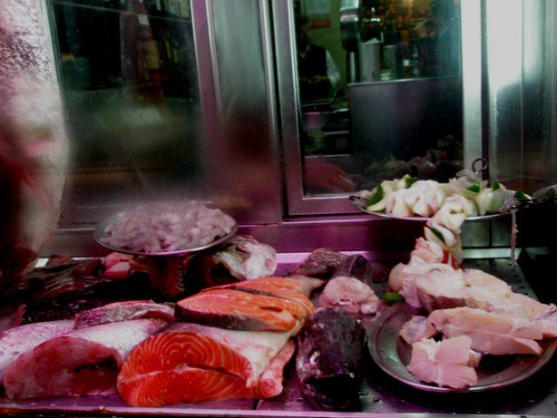 魚やイカやたこを串刺しにしたグリル料理店が並び、それではと気合を入れて入る。