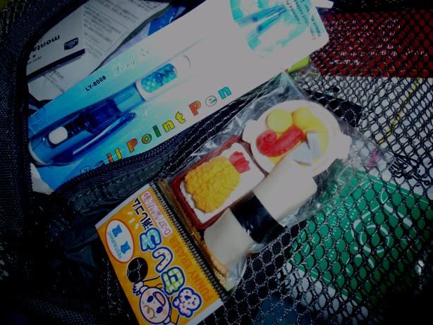 旅先では知り合った人にピカーと光るペンか、消しゴムをあげます。