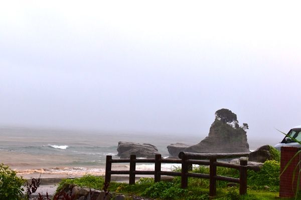 雄大な景色と言いたいところだが、風と薄暗さと大雨で、名誉ある撤退である。滞在時間20秒である。えらい着くまでに時間かかってもたのにな。砂鉄が多いらしいぜ。いや、車からでるのも、もうやめとくわ、状態である。しかし、何度も低地を通ると、車がえらい沈むわ。