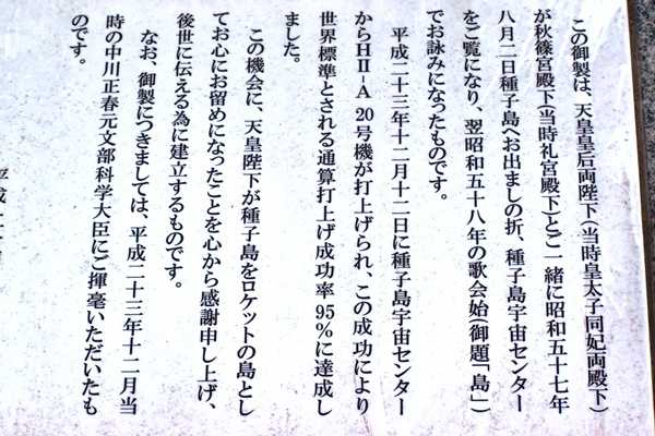 「大空に打上げせまるロケットは 島の南の果に立ちたり」 上皇陛下(当時皇太子殿下)作。そうか、昭和時代か。