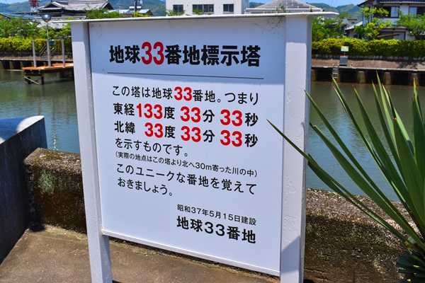 2002年(平成14年)4月1日。 緯度経度の測量基準がそれまでの日本測地系から世界測地系へ移行し、これに伴い世界測地系による東経133度33分33.333秒・北緯33度33分33.333秒の正しい位置は、高知市立昭和小学校の南東角近傍の高知市日の出町7-47であり、旧日本測地系による位置から南東へ約445 メートルのところだってさ、あんたも好きねえ。