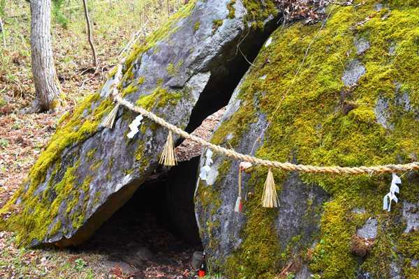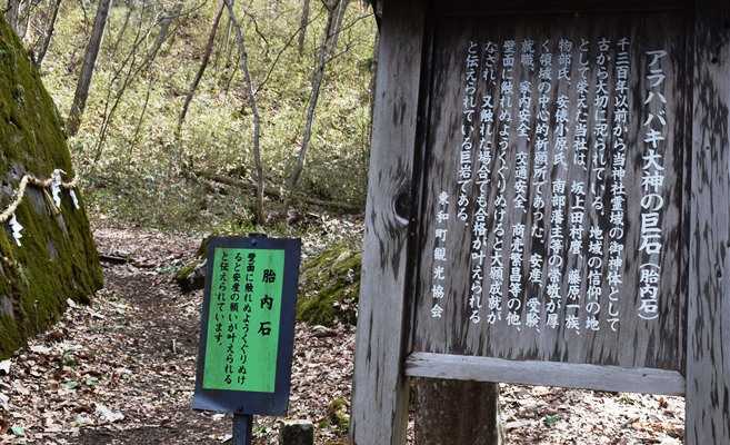 安産、受験、就職、家内安全、交通安全、商売繁盛の他、壁面に触れぬようくぐりぬけると大願成就がなされ、又触れた場合でも合格が叶えられると伝えられている巨石である。