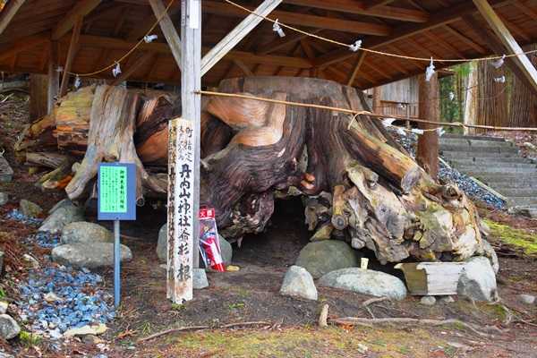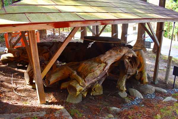いきなり現れる杉の根株は、根元回り12.12メートル、高さ約60メートル、樹齢2000年の古木と伝えられている。