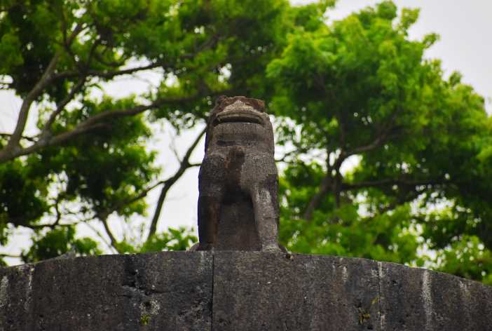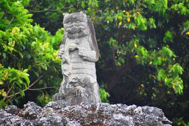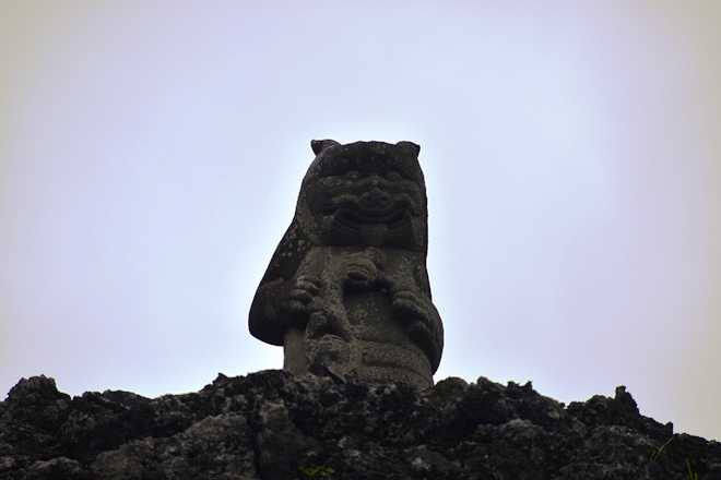 塔の上に置かれた左側シーサー。子どもシーサーを抱っこしているように見えるが。