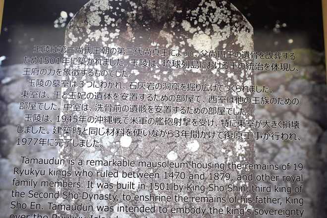 1501年に尚真王の父親である尚円王の遺骨を埋葬するために作られ、それ以降の歴代の国王が葬られている。墓室は向かって左から、東室、中室、西室の3つに分かれている。