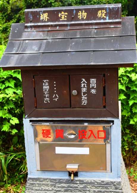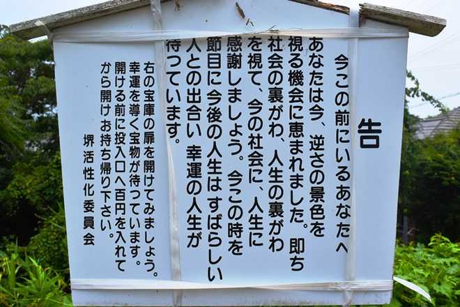 あなたは今逆さの景色を視る機会に恵まれました。 即ち社会の裏がわ、人生の裏がわを視て、 今の社会に、人生に感謝しましょう。今この時を節目に今後の人生はすばらしい人との出合い幸運の人生が待っています。つまり、ここでも、見るな、感じろの世界。社会とか人生の裏側、薄っぺらな俺には見えなかった、ごめんなさい。右の宝庫の扉を開けてみましょう。幸運を導く宝物が待っています。開ける前に投入口へ百円を入れてから開けお持ち帰り下さい。堺活性化委員会、とのことです。