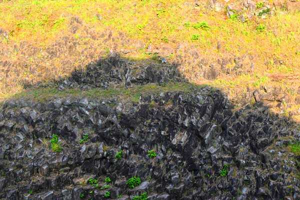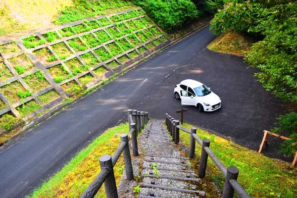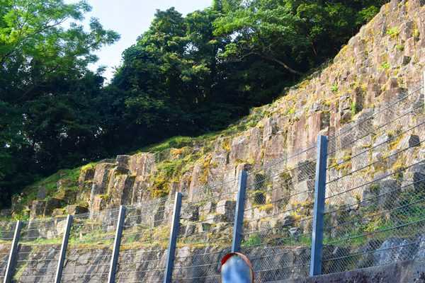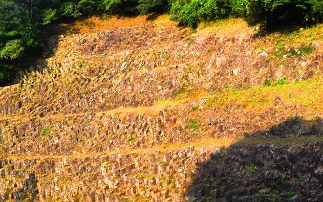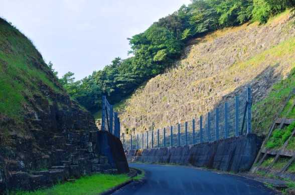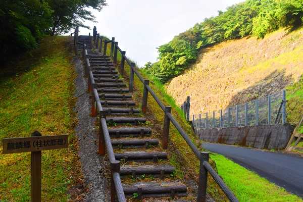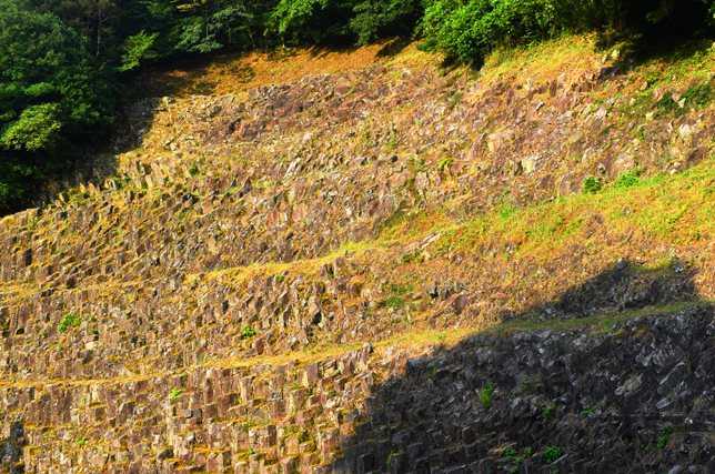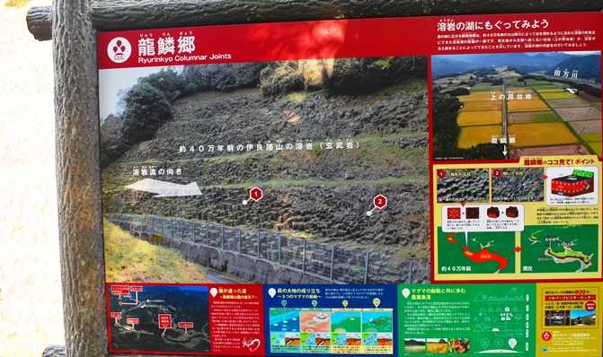 説明によると、農道工事の際に偶然発見された、六角形の石柱が立ち並ぶ玄武岩柱状節理。地元では、中学生が名づけた「龍鱗郷」の愛称で呼ばれている。