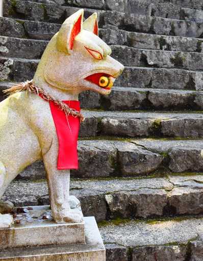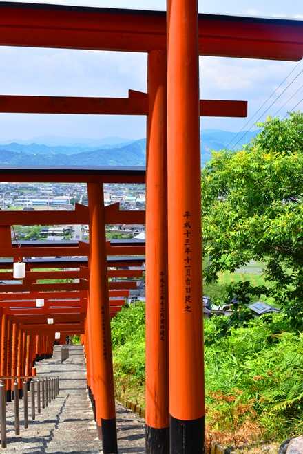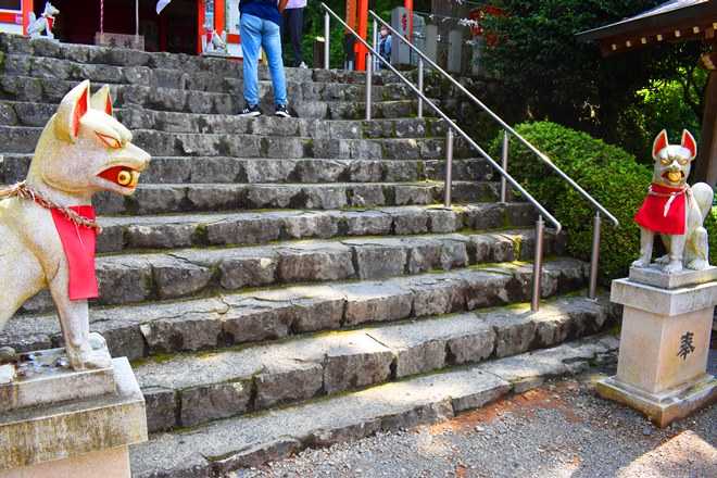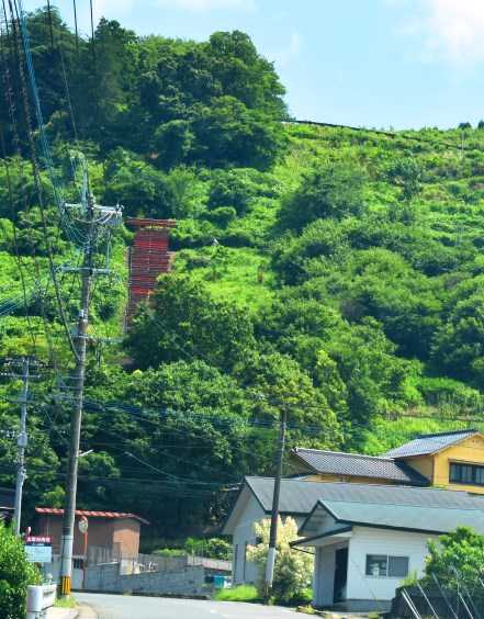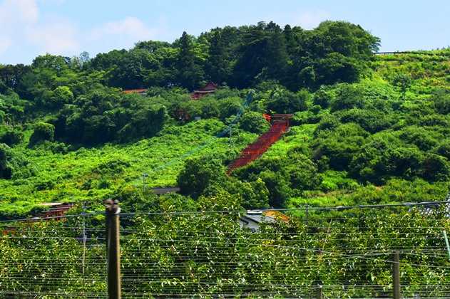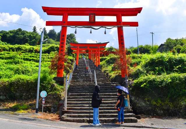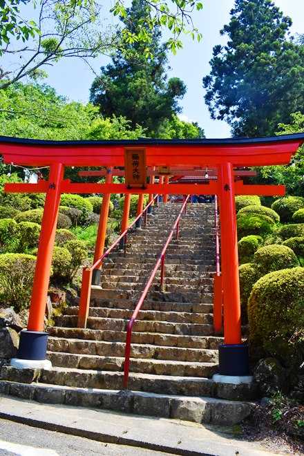 300段ほどの階段、参道は途中で斜め45度位に曲がっている。