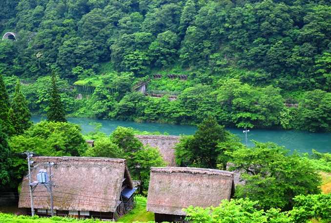 山あいを流れる庄川のわずかな河岸段丘にある菅沼集落は、現在9戸の合掌造り家屋が残っている。(村は12戸)
