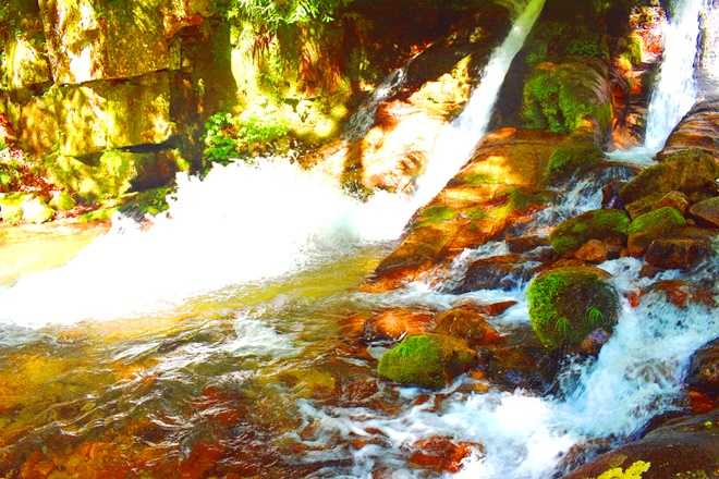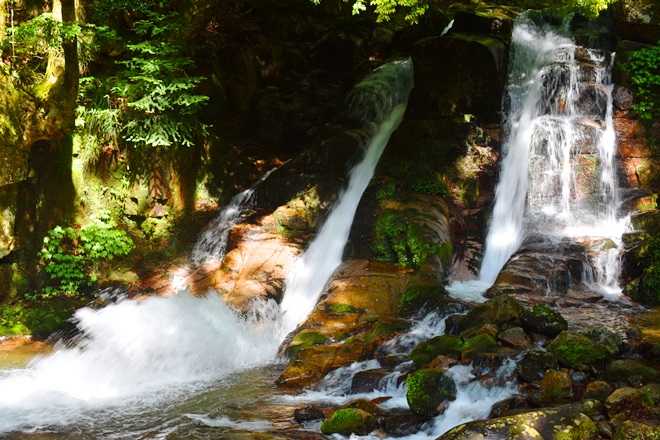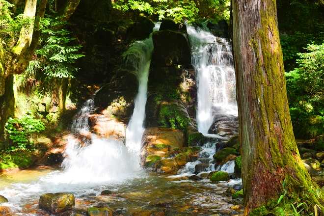 幅 12.5メートル、落差15.1メートル、岩肌を三筋に分かれて流れ落ちる。その一つが跳ね上がる。