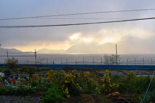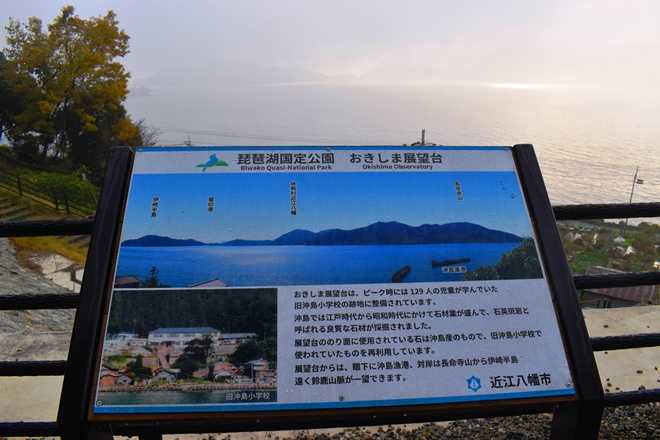 旧小学校跡地に沖島展望台。漁業以外にも、島が石英斑岩から成り立っており、石材資源に恵まれており、江戸時代から昭和40年代、コンクリートの時代になるまで島民の収入源でもあった。