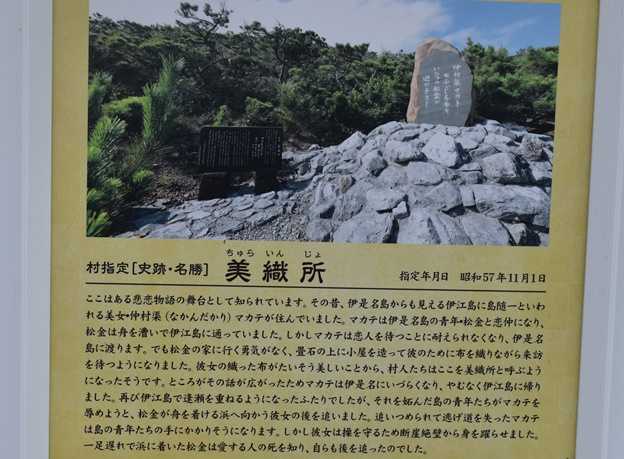 昔々、伊江島一番の美人といわれたマカトは、伊是名島の美青年松金と恋仲になったんよ。マカトは、ある日意を決し、恋人のいる伊是名島に渡って来たものの、松金の家に行くわけにもいかず、この畳石の上に小舎をつくり、ここで布を織るようになった。しかし、村一番の美女を他の島の男に奪われたことに嫉妬した伊江島の男たちはマカトを追いかけた。それで、マカトは自ら伊江島の崖から身を投げてしまったという哀しい伝。