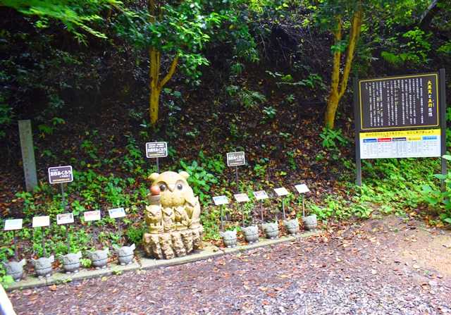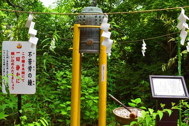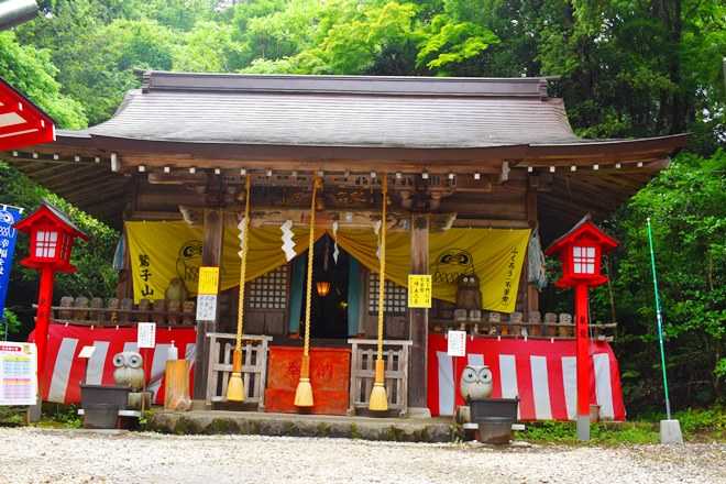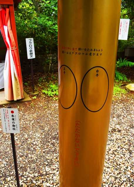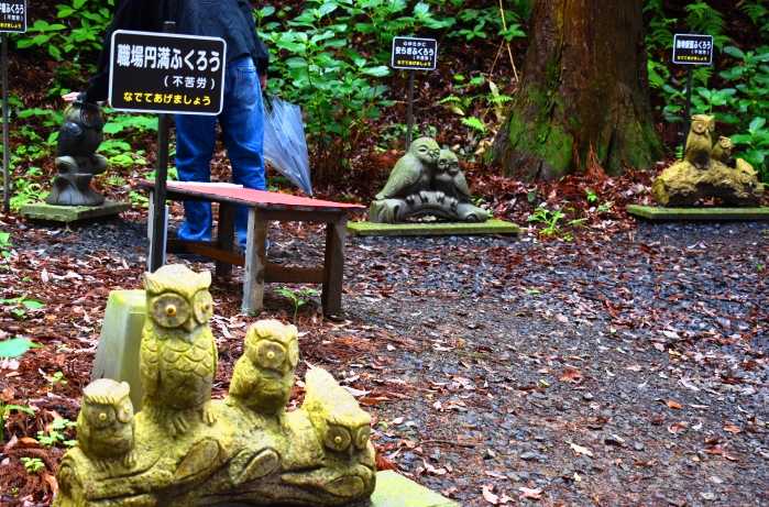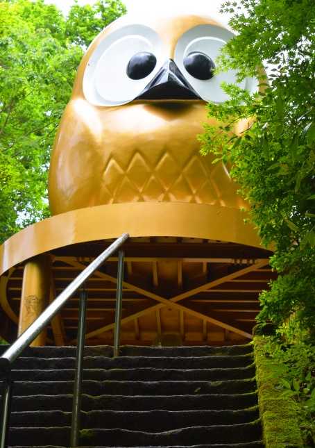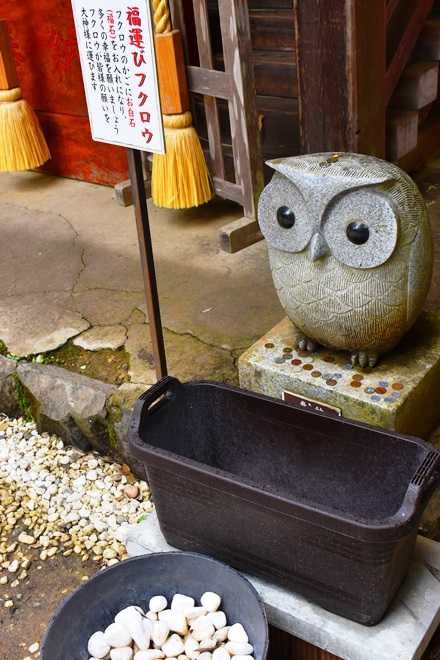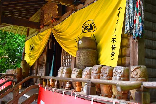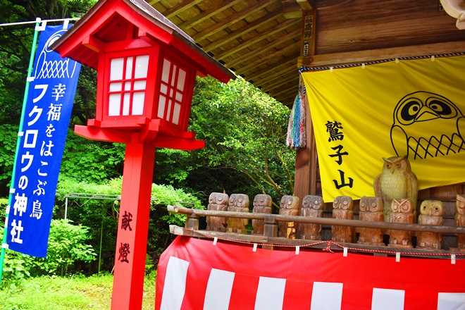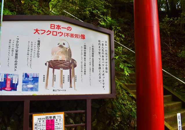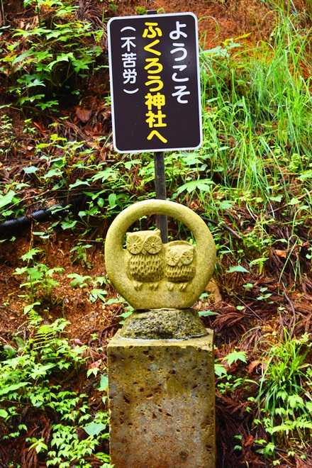 日本一の梟(不苦労)像がある。石段は、社務所より拝殿前まで96段(苦労)。