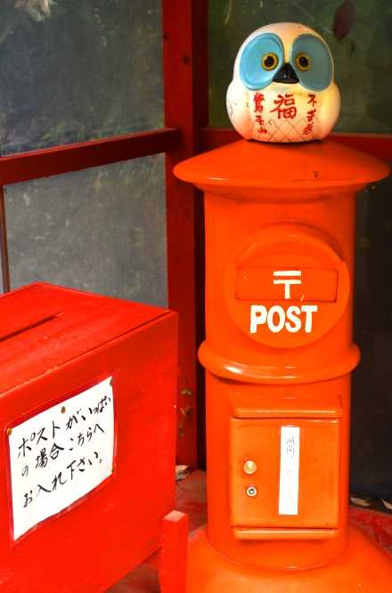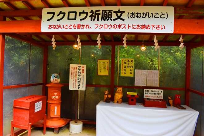 梟ポスト。神社内のみのポストであり、普通郵便ではない。
