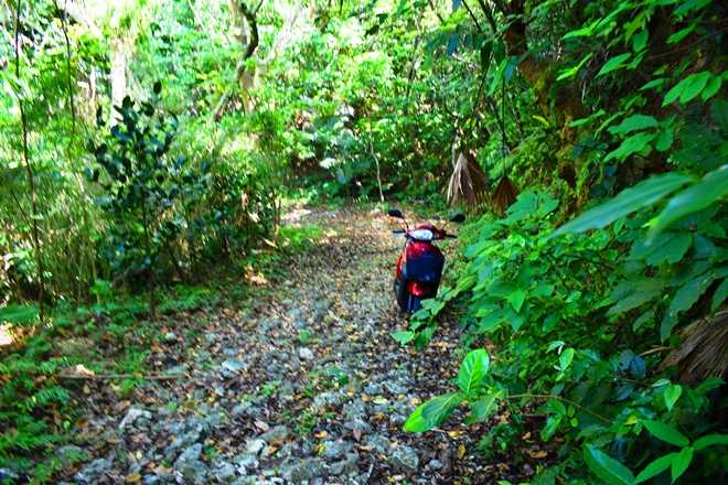 人面岩近くに脇道があったので、原付走らせるが、酷いでこぼこ道でパンク心配になりながら頑張ってみる。
