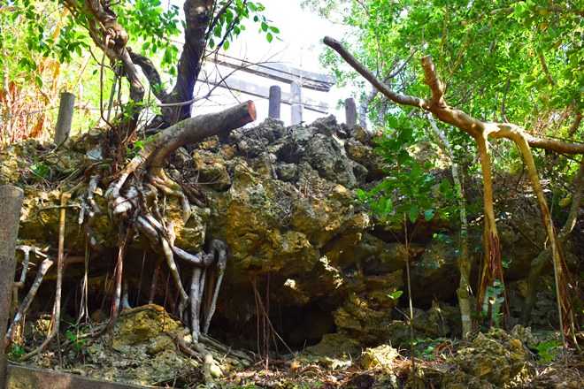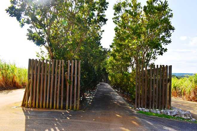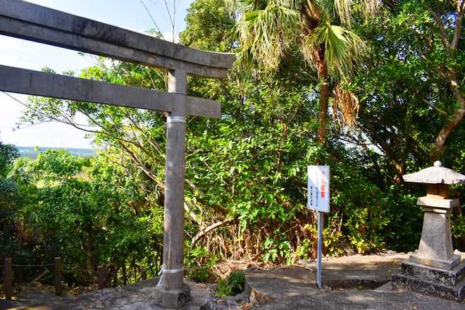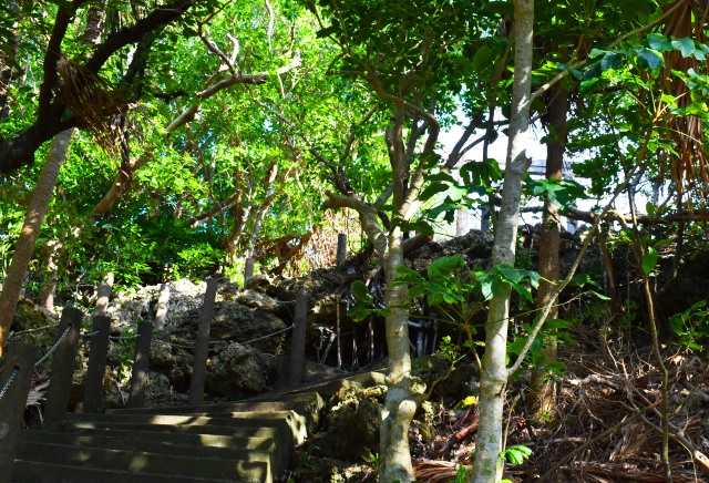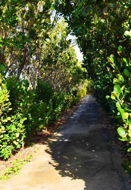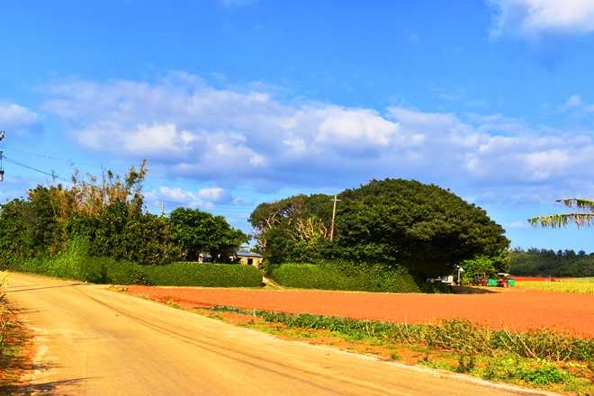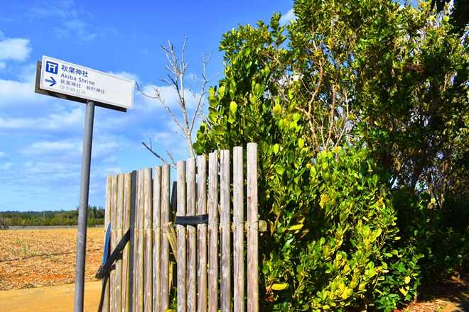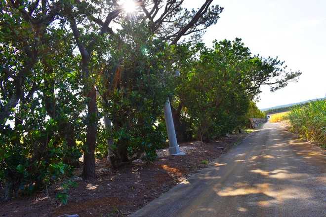 参道の途中に鳥居があり、更にフクギ並木が続き、抜けたら神社の森に突き当たるシステム。
