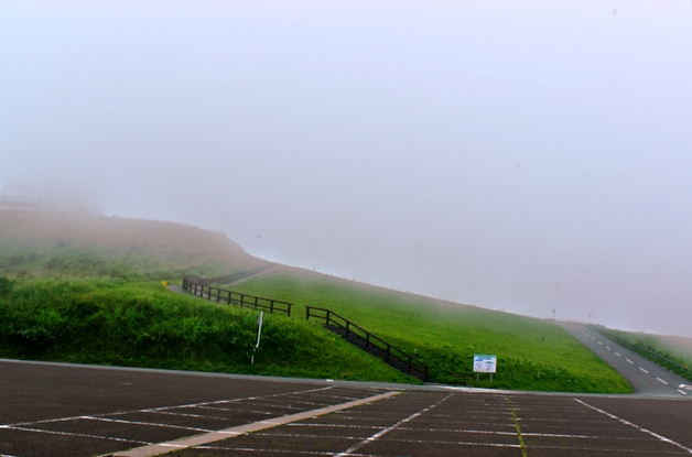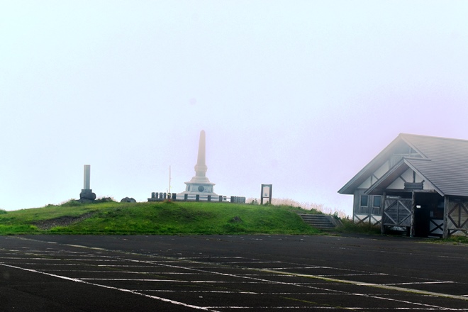 展望台まで上がってきたら、霧が急に出て、見えなくなってきた。五箇条の御誓文を石に刻んだ誓いの御柱。