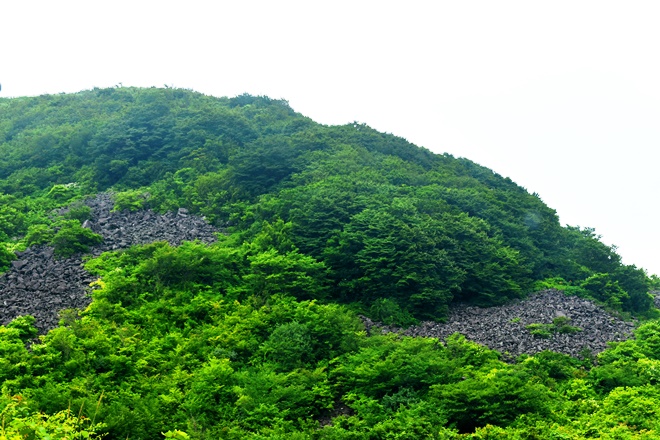 安山岩。この岩は「男鹿石」と呼ばれる。ほとんどのエリアでその上を薄い表土と芝生で覆われている。