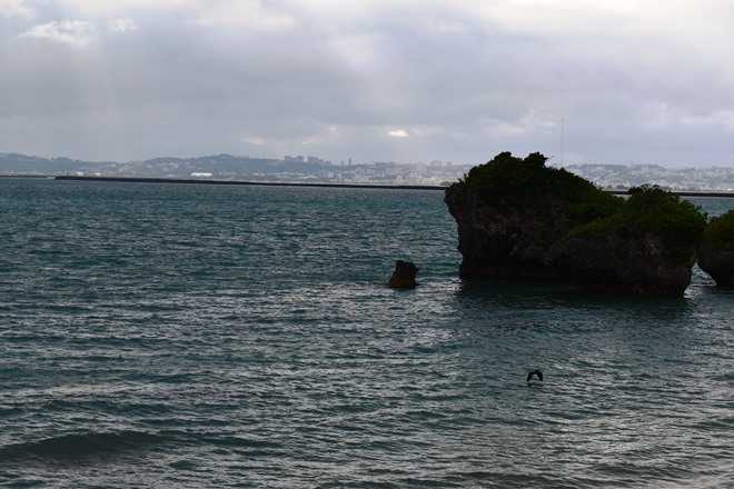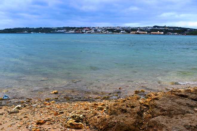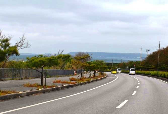 屋慶名展望台見える。左が島で展望台の右側が本土。