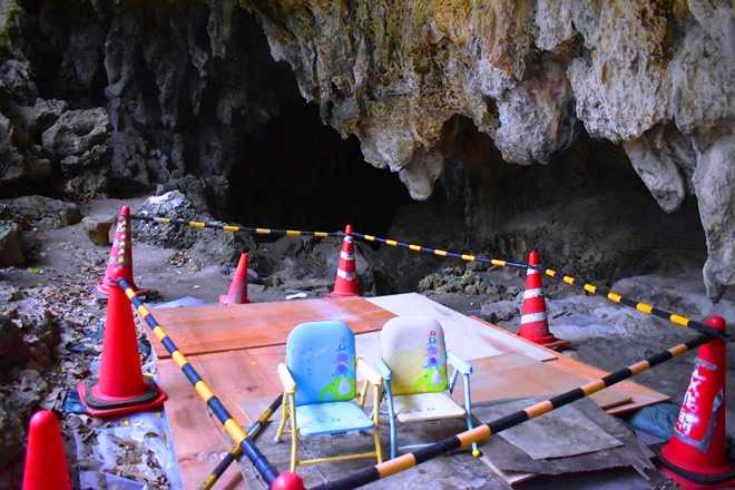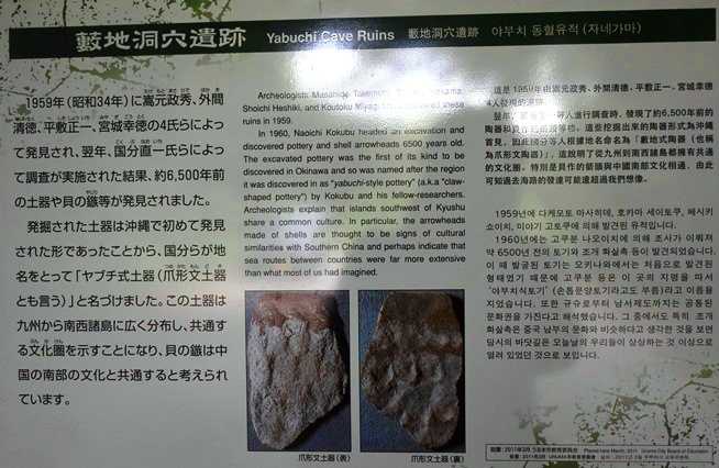 ジャネー洞は拝所でもあるが、藪地洞窟遺跡でもあり、古代の住居跡で6500年前の縄文時代の土器のかけらが出土している。