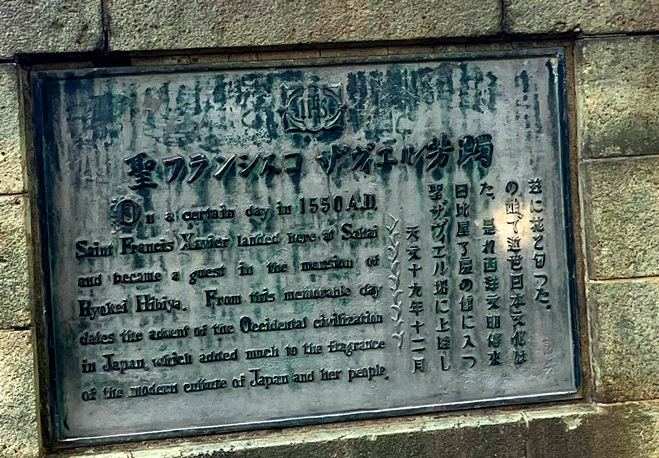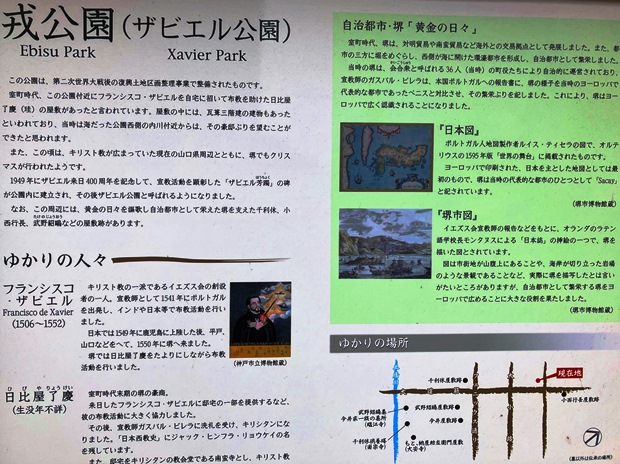 堺駅を降りると、橋の上からFザビエルが堺を懐かしみながら眺める。中世には外国貿易が盛んな自治都市として博多と並ぶ商人の街へと発展し、環濠都市を築いた。ルイスフロイスいわく東洋のベニスとも。江戸時代には幕府の直轄地となる。