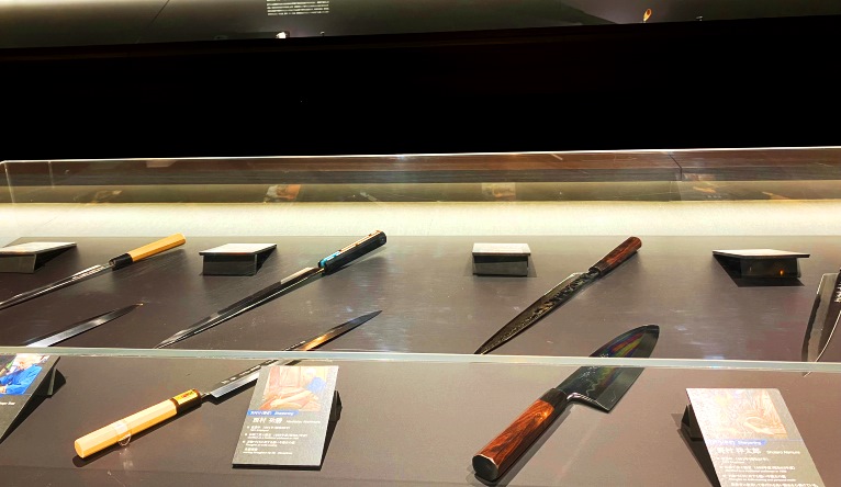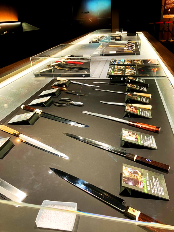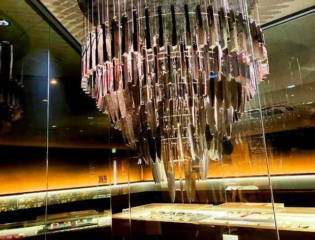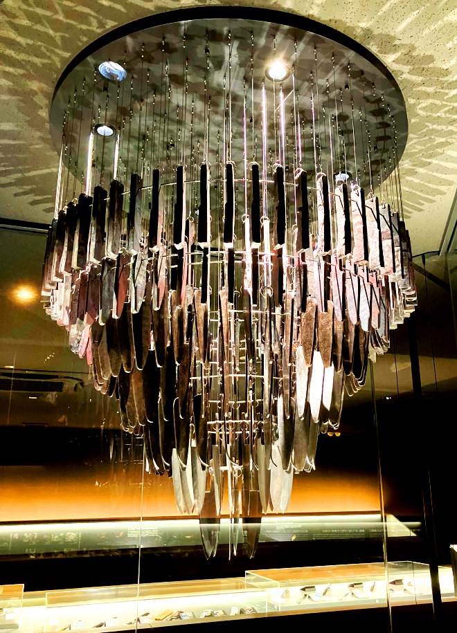 包丁の工程ごとの素材を用いて製作したシャンデリア「HIBANA」(火刃七)。300本7段。